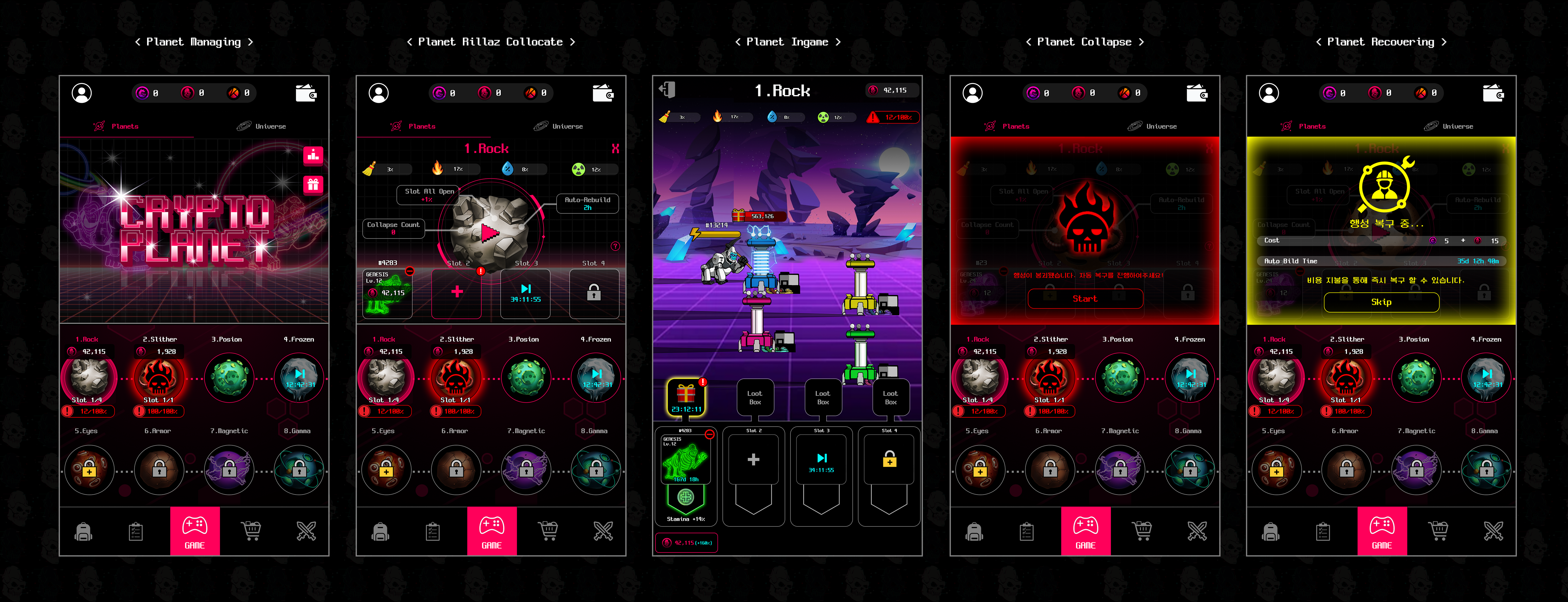 The MetaBrickz team, specialists in using the Unity engine and Spine tool, is developing a system that includes wallet creation, transfer, and listing using the Klaytn blockchain technology. This effort aims to provide a more versatile mobile gaming experience and the possibility of profit for gamers.The P2E economy operates on a dual token system, utilizing governance tokens (MBT) and utility tokens (MRT). With V1, V2 NFT, you can guarantee daily token rewards (MBT, MRT) through various activities. Use the acquired tokens for direct level-ups, stamina repair, planet management, and even the breeding of new-generation MetaRillaz NFTs through the RillaZ experience.