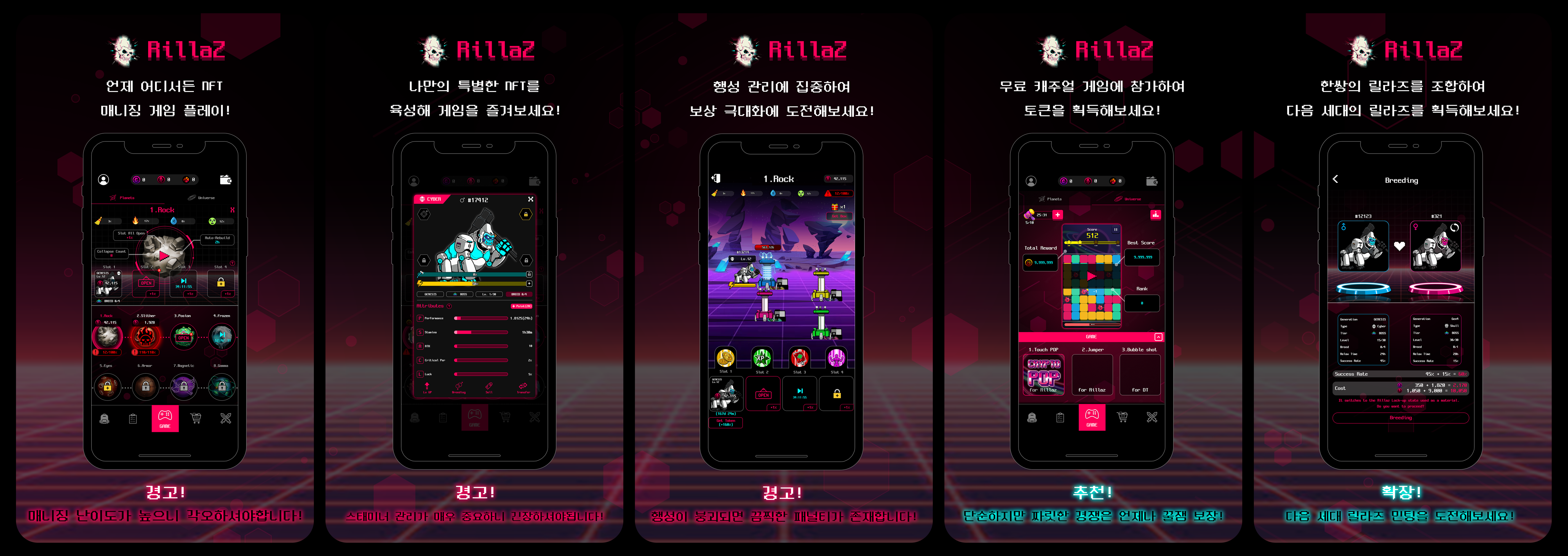 * RIllaZ NFT will be used in Rillaz P2E and will be divided into n rounds according to the minting time. The total number of Rillaz NFT issued is n, and it consists of 5 Attributes (Performance, Stamina, Attack, Critical, and Luck).