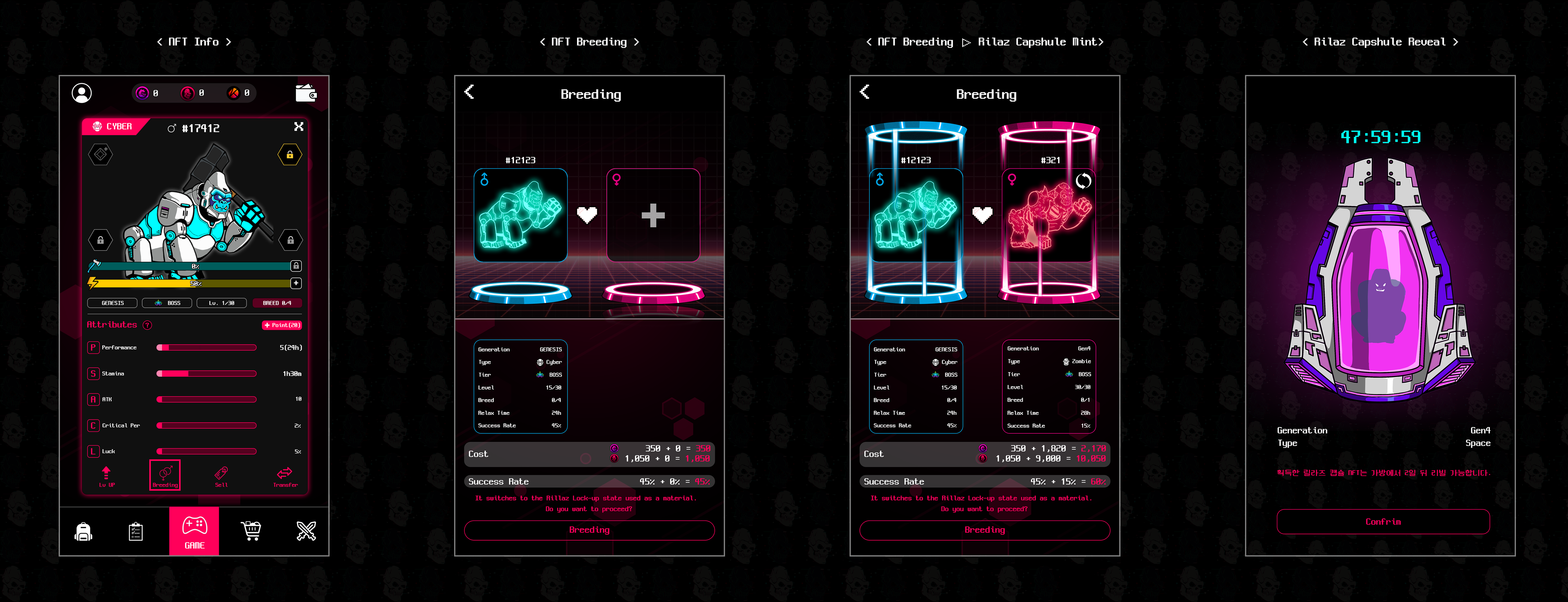 * ex) Rillaz GENESIS NFT(Boss) 45% + Rillaz Gen1 NFT(Minion) 15% = Success Odds 60%